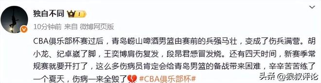 媒体人“独自不同”发文点评:“CBA俱乐部杯赛事先,青岛崂山啤酒男篮由赛前的残兵败将,变成了伤兵满营。胡小龙、纪卓崴了脚,王奕博肩伤复发,段昂君感冒发烧。还有四天时间,新赛季惯例赛就要开打了,这么多伤病员一定会给青岛男篮的备战带来困难,辛辛劳苦练了一个夏天,伤病一来全毁了”。