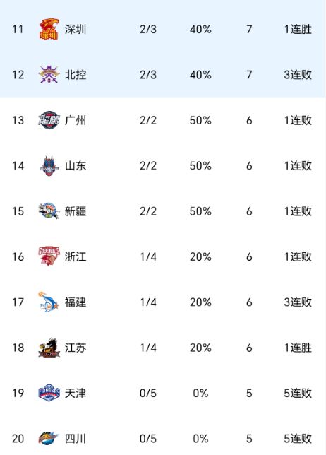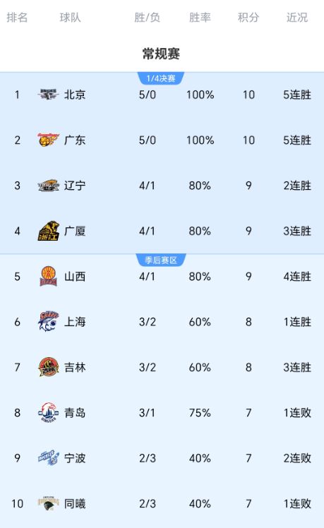 随着广东+上海+广厦全赢球,CBA最新积分榜如下:2队全胜+2队全败