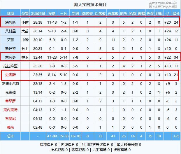湖人:东契奇34分5板7助3断、詹姆斯24分3板5助2断、史密斯21分3板1助、八村塁12分4板1助2断、艾顿11分11板2助2帽、拉拉维亚11分2板4助2断、范德比尔特5分2板2断、克内克特3分1板