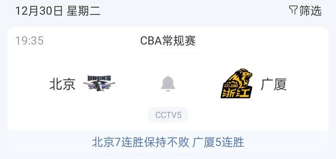 当然了,如果说这赛季谁最有可能终结北京队的连胜,那绝对非广厦莫属,他们也是最有经验的。根据赛程安排,这场比赛将在北京时间12月30日晚上7点35分进行,到时CCTV5会全程进行直播,大家可以准时进行收看。最后想问一句,你觉得这两队相遇,谁能笑到最后?