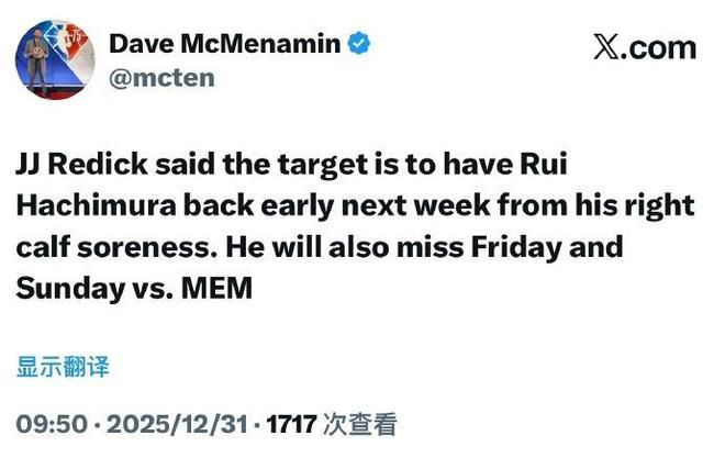 北京时间12月31日,湖人的伤病危机再度来袭,根据湖人主帅雷迪克透露,球队主力前锋八村塁因为右小腿酸痛,预计将缺席一周比赛。