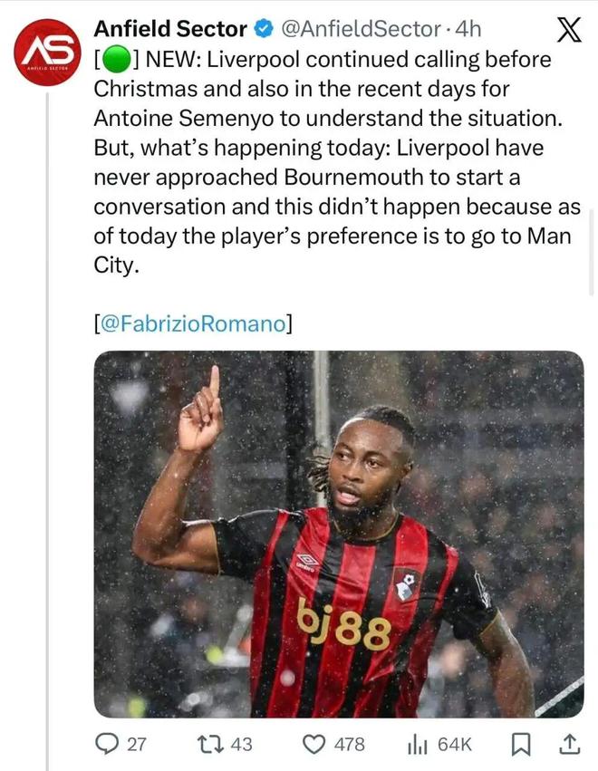 不止罗马诺,卫报、邮报各大报纸都跟进了利物浦介入的消息。为什么曼城已经达成协议却迟迟不here we go呢?利物浦是谁打的电话?要知道当初塞梅尼奥就是休斯带到伯恩茅斯的。