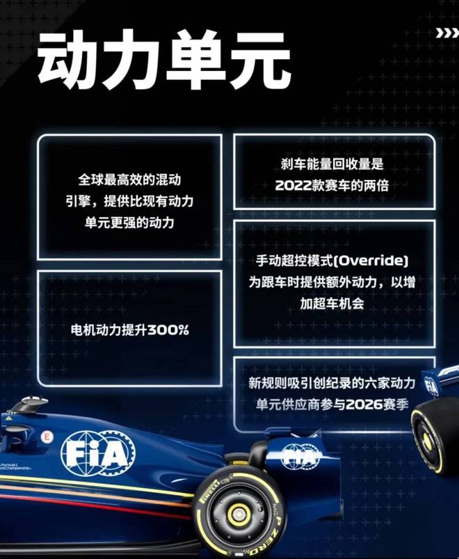 而 26 年则将有 5 家动力单元供应商同场竞技,法拉利、梅赛德斯继续留在场上,本田将与阿斯顿马丁协作,而福特将与红牛动力总成协作,奥迪将初次参与。而 Alpine 坚持雷诺转投梅赛德斯,新参与的凯迪拉克则将先运用法拉利引擎以等候自家引擎开发完成。