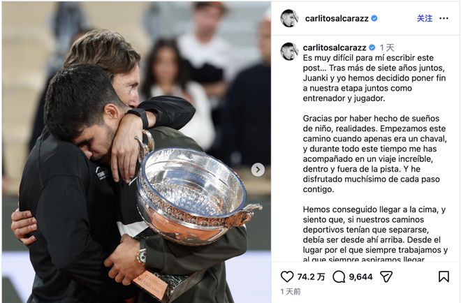 在“分手公告”中,阿尔卡拉斯感谢了费雷罗让自己童年的梦想成真,协助他“生长为一个更好的人”。他说:“我享用这一路走来的进程,也将永远铭刻这段旅程。”